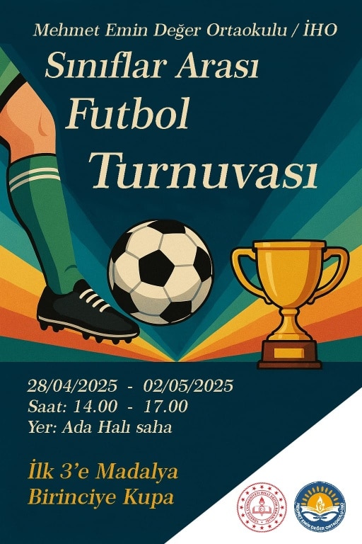 2024- 2025 Mehmet Emin Değer Ortaokulu/İmam Hatip Ortaokulu sınıflar arası Geleneksel Futbol Turnuvası düzenlenecek. Tüm öğrencilerimiz ve velilerimiz davetlidir.